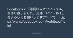 寺岡呼人 @yohito_teraoka – 22:42・2013年10月14日 2013 10/14 寺岡呼人 2013-10-14 Facebookで「寺岡呼人オフィシャル」を作り直しました。是非「いいーね!」をよろしくお願いします(*^_^*) https://www.facebook.com/yohito.official Source:https://x.com/yohito_teraoka/status/38974800589... text X Post 寺岡呼人 寺岡呼人 この記事が気に入ったら フォローしてね! Follow @OtokoTimes1988 よかったらシェアしてね! URLをコピーしました! 青山英樹 @aoyama_hideki - 15:04・2013年10月14日 寺岡呼人 @yohito_teraoka - 23:40・2013年10月14日 関連記事 Artist 寺岡呼人 1968.02.07