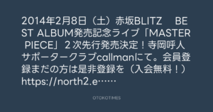 2014年2月8日(土)赤坂BLITZ  BEST ALBUM発売記念ライブ「MASTER PIECE」2次先行発売決定!寺岡呼人サポータークラブcallmanにて。会員登録まだの方は是非登録を(入会無料!)https://north2.eplus.jp/sys/web/meetsfan/callman/index.jsp