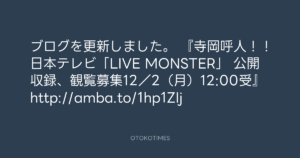 寺岡呼人 @yohito_teraoka – 1:03・2013年12月1日 2013 12/01 寺岡呼人 2013-12-01 ブログを更新しました。 『寺岡呼人!!日本テレビ「LIVE MONSTER」 公開収録、観覧募集12/2(月)12:00受』 http://amba.to/1hp1ZIj Source:https://x.com/yohito_teraoka/status/40681582522... text X Post 寺岡呼人 寺岡呼人 この記事が気に入ったら フォローしてね! Follow @OtokoTimes1988 よかったらシェアしてね! URLをコピーしました! Koyo Maeda @koyomaeda - 0:51・2013年12月1日 Koyo Maeda @koyomaeda - 10:10・2013年12月1日 関連記事 Artist 寺岡呼人 1968.02.07