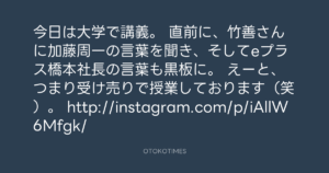 寺岡呼人 @yohito_teraoka – 13:25・2013年12月17日 2013 12/17 寺岡呼人 2013-12-17 今日は大学で講義。 直前に、竹善さんに加藤周一の言葉を聞き、そしてeプラス橋本社長の言葉も黒板に。 えーと、つまり受け売りで授業しております(笑)。 http://instagram.com/p/iAllW6Mfgk/ Source:https://x.com/yohito_teraoka/status/41280057812... text X Post 寺岡呼人 寺岡呼人 この記事が気に入ったら フォローしてね! Follow @OtokoTimes1988 よかったらシェアしてね! URLをコピーしました! 寺岡 呼人 @yohitoteraoka - 13:22・2013年12月17日(IG post) 青山英樹 @aoyama_hideki - 15:53・2013年12月17日 関連記事 Artist 寺岡呼人 1968.02.07