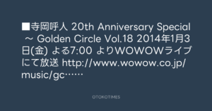 寺岡呼人 @yohito_teraoka – 23:14・2013年12月23日 2013 12/23 寺岡呼人 2013-12-23 ■寺岡呼人 20th Anniversary Special ~ Golden Circle Vol.18 2014年1月3日(金) よる7:00 よりWOWOWライブにて放送 http://www.wowow.co.jp/music/gc/ Source:https://x.com/yohito_teraoka/status/41512313119... text X Post 寺岡呼人 寺岡呼人 この記事が気に入ったら フォローしてね! Follow @OtokoTimes1988 よかったらシェアしてね! URLをコピーしました! 青山英樹 @aoyama_hideki - 20:28・2013年12月23日 青山英樹 @aoyama_hideki - 18:31・2013年12月24日 関連記事 Artist 寺岡呼人 1968.02.07
