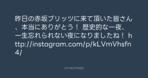 寺岡呼人 @yohito_teraoka – 10:37・2014年2月9日 2014 2/09 寺岡呼人 2014-02-09 昨日の赤坂ブリッツに来て頂いた皆さん、本当にありがとう! 歴史的な一夜、一生忘れられない夜になりましたね! http://instagram.com/p/kLVmVhsfn4/ Source:https://x.com/yohito_teraoka/status/43232738785... text X Post 寺岡呼人 寺岡呼人 この記事が気に入ったら フォローしてね! Follow @OtokoTimes1988 よかったらシェアしてね! URLをコピーしました! 寺岡 呼人 @yohitoteraoka - 10:37・2014年2月9日(IG post) 青山英樹 @aoyama_hideki - 20:55・2014年2月9日 関連記事 Artist 寺岡呼人 1968.02.07