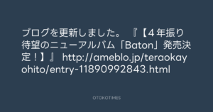 寺岡呼人 @yohito_teraoka – 19:49・2014年7月8日 2014 7/08 寺岡呼人 2014-07-08 ブログを更新しました。 『【4年振り待望のニューアルバム「Baton」発売決定!】』 http://ameblo.jp/teraokayohito/entry-11890992843.html Source:https://x.com/yohito_teraoka/status/48646216089... text X Post 寺岡呼人 寺岡呼人 この記事が気に入ったら フォローしてね! Follow @OtokoTimes1988 よかったらシェアしてね! URLをコピーしました! 青山英樹 @aoyama_hideki - 16:27・2014年7月8日 Koyo Maeda @koyomaeda - 6:03・2014年7月9日 関連記事 Artist 寺岡呼人 1968.02.07
