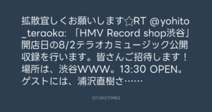 拡散宜しくお願いします⭐︎RT @yohito_teraoka: 「HMV Record shop渋谷」開店日の8/2テラオカミュージック公開収録を行います。皆さんご招待します!場所は、渋谷WWW。13:30 OPEN。ゲストには、浦沢直樹さん、そしてTHE NEATBEATS。