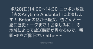 ◾︎9/28(日)14:00〜14:30 ニッポン放送「杏のAnytime Andante」に出演します!