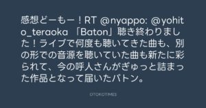 感想どーもー!RT @nyappo: @yohito_teraoka 「Baton」聴き終わりました!ライブで何度も聴いてきた曲も、別の形での音源を聴いていた曲も新たに彩られて、今の呼人さんがぎゅっと詰まった作品となって届いたバトン。