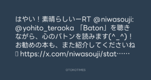 はやい!素晴らしいーRT @niwasouji: @yohito_teraoka 「Baton」を聴きながら、心のバトンを読みます(^_^)! お勧めの本も、また紹介してくださいね♡ https://x.com/niwasouji/status/515782252693704704/photo/1