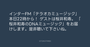 寺岡呼人 @yohito_teraoka – 18:36・2015年2月17日 2015 2/17 寺岡呼人 2015-02-17 インターFM「テラオカミュージック」本日22時から! ゲストは桜井和寿。 「桜井和寿のDNAミュージック」をお届けします。是非聴いて下さいね。 Source:https://x.com/yohito_teraoka/status/56761849762... text X Post 寺岡呼人 寺岡呼人 この記事が気に入ったら フォローしてね! Follow @OtokoTimes1988 よかったらシェアしてね! URLをコピーしました! 寺岡 呼人 @yohitoteraoka - 08:52・2015年2月17日(IG post) Koyo Maeda @koyomaeda - 23:59・2015年2月17日 関連記事 Artist 寺岡呼人 1968.02.07