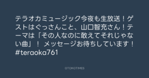 テラオカミュージック今夜も生放送!ゲストはぐっさんこと、山口智充さん!テーマは「その人なのに敢えてそれじゃない曲」!