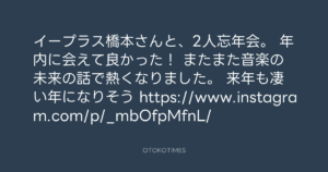 寺岡呼人 @yohito_teraoka – 1:13・2015年12月23日 2015 12/23 寺岡呼人 2015-12-23 イープラス橋本さんと、2人忘年会。 年内に会えて良かった! またまた音楽の未来の話で熱くなりました。 来年も凄い年になりそう😤😤😤 https://www.instagram.com/p/_mbOfpMfnL/ Source:https://x.com/yohito_teraoka/status/67933405562... text X Post 寺岡呼人 寺岡呼人 この記事が気に入ったら フォローしてね! Follow @OtokoTimes1988 よかったらシェアしてね! URLをコピーしました! 寺岡 呼人 @yohitoteraoka - 01:13・2015年12月23日(IG post) 寺岡 呼人 @yohitoteraoka - 01:13・2015年12月23日(IG post) 関連記事 Artist 寺岡呼人 1968.02.07