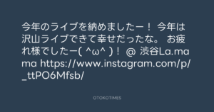 寺岡呼人 @yohito_teraoka – 21:05・2015年12月25日 2015 12/25 寺岡呼人 2015-12-25 今年のライブを納めましたー! 今年は沢山ライブできて幸せだったな。 お疲れ様でしたー( ^ω^ )! @ 渋谷La.mama https://www.instagram.com/p/_ttPO6Mfsb/ Source:https://x.com/yohito_teraoka/status/68035882564... text X Post 寺岡呼人 寺岡呼人 この記事が気に入ったら フォローしてね! Follow @OtokoTimes1988 よかったらシェアしてね! URLをコピーしました! 寺岡 呼人 @yohitoteraoka - 21:05・2015年12月25日(IG post) 青山英樹 @aoyama_hideki - 23:57・2015年12月25日 関連記事 Artist 寺岡呼人 1968.02.07