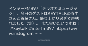 インターFM897「テラオカミュージック」、今日のゲストはKEYTALKの寺中さんと首藤さん。盛り上がり過ぎて声枯れました(笑)。