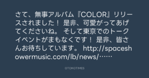寺岡呼人 @yohito_teraoka – 14:14・2016年8月5日 2016 8/05 寺岡呼人 2016-08-05 さて、無事アルバム『COLOR』リリースされました! 是非、可愛がってあげてくださいね。 そして東京でのトークイベントがまもなくです! 是非、皆さんお待ちしています。 http://spaceshowermusic.com/lb/news/57828/ Source:https://x.com/yohito_teraoka/status/76143021311... text X Post 寺岡呼人 寺岡呼人 この記事が気に入ったら フォローしてね! Follow @OtokoTimes1988 よかったらシェアしてね! URLをコピーしました! 🎬 寺岡 呼人 @yohitoteraoka - 14:13・2016年8月5日(IG post) 寺岡呼人 @yohito_teraoka - 14:36・2016年8月7日 関連記事 Artist 寺岡呼人 1968.02.07