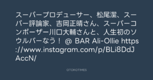 スーパープロデューサー、松尾潔、スーパー評論家、吉岡正晴さん、スーパーコンポーザー川口大輔さんと、人生初のソウルバーなう! @ BAR Ali-Ollie https://www.instagram.com/p/BLi8DdJAccN/