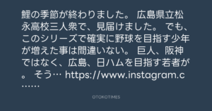 寺岡呼人 @yohito_teraoka – 0:20・2016年10月30日 2016 10/30 寺岡呼人 2016-10-30 鯉の季節が終わりました。 広島県立松永高校三人衆で、見届けました。 でも、このシリーズで確実に野球を目指す少年が増えた事は間違いない。 巨人、阪神ではなく、広島、日ハムを目指す若者が。 そう… https://www.instagram.com/p/BMJtIJDgiP3/ Source:https://x.com/yohito_teraoka/status/79238562415... text X Post 寺岡呼人 寺岡呼人 この記事が気に入ったら フォローしてね! Follow @OtokoTimes1988 よかったらシェアしてね! URLをコピーしました! 寺岡 呼人 @yohitoteraoka - 00:20・2016年10月30日(IG post) Koyo Maeda @koyomaeda - 13:30・2016年10月30日 関連記事 Artist 寺岡呼人 1968.02.07