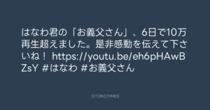 はなわ君の「お義父さん」、6日で10万再生超えました。是非感動を伝えて下さいね!