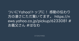 寺岡呼人 @yohito_teraoka – 13:56・2017年3月14日 2017 3/14 寺岡呼人 2017-03-14 ついにYahoo!トップに! 感動の伝わり方の凄さにただ驚いてます。 https://news.yahoo.co.jp/pickup/6233081 #お義父さん #はなわ Source:https://x.com/yohito_teraoka/status/84151344214... text X Post 寺岡呼人 寺岡呼人 この記事が気に入ったら フォローしてね! Follow @OtokoTimes1988 よかったらシェアしてね! URLをコピーしました! Koyo Maeda @koyomaeda - 12:55・2017年3月14日 Koyo Maeda @koyomaeda - 15:45・2017年3月14日 関連記事 Artist 寺岡呼人 1968.02.07