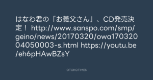 寺岡呼人 @yohito_teraoka – 13:31・2017年3月20日 2017 3/20 寺岡呼人 2017-03-20 はなわ君の「お義父さん」、CD発売決定! http://www.sanspo.com/smp/geino/news/20170320/owa17032004050003-s.html https://youtu.be/eh6pHAwBZsY Source:https://x.com/yohito_teraoka/status/84368130366... text X Post 寺岡呼人 寺岡呼人 この記事が気に入ったら フォローしてね! Follow @OtokoTimes1988 よかったらシェアしてね! URLをコピーしました! Koyo Maeda @koyomaeda - 8:18・2017年3月20日 寺岡呼人 @yohito_teraoka - 22:18・2017年3月20日 関連記事 Artist 寺岡呼人 1968.02.07