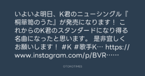 寺岡呼人 @yohito_teraoka – 15:48・2017年6月13日 2017 6/13 寺岡呼人 2017-06-13 いよいよ明日、K君のニューシングル『桐箪笥のうた』が発売になります! これからのK君のスタンダードになり得る名曲になったと思います。 是非宜しくお願いします! #K #歌手K… https://www.instagram.com/p/BVRTB_fhJ6D/ Source:https://x.com/yohito_teraoka/status/87451893700... text X Post 寺岡呼人 寺岡呼人 この記事が気に入ったら フォローしてね! Follow @OtokoTimes1988 よかったらシェアしてね! URLをコピーしました! 寺岡 呼人 @yohitoteraoka - 15:48・2017年6月13日(IG post) 寺岡呼人 @yohito_teraoka - 0:53・2017年6月14日 関連記事 Artist 寺岡呼人 1968.02.07