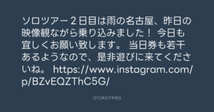 ソロツアー2日目は雨の名古屋、昨日の映像観ながら乗り込みました!