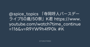 寺岡呼人 @yohito_teraoka – 0:38・2017年11月29日 2017 11/29 寺岡呼人 2017-11-29 @spice_topics 「寺岡呼人バースデーライブ50歳/50祭」K君 https://www.youtube.com/watch?time_continue=116&v=R9YW9h4fP0k #K Source:https://x.com/yohito_teraoka/status/93553330000... text X Post 寺岡呼人 寺岡呼人 この記事が気に入ったら フォローしてね! Follow @OtokoTimes1988 よかったらシェアしてね! URLをコピーしました! 寺岡呼人 @yohito_teraoka - 0:37・2017年11月29日 寺岡呼人 @yohito_teraoka - 0:38・2017年11月29日 関連記事 Artist 寺岡呼人 1968.02.07