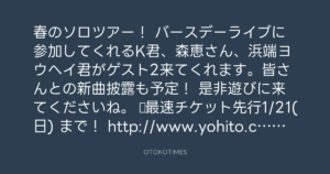 バースデーライブに参加してくれるK君、森恵さん、浜端ヨウヘイ君がゲスト2来てくれます。皆さんとの新曲披露も予定!