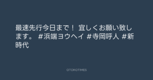 寺岡呼人 @yohito_teraoka – 12:04・2019年4月7日 2019 4/07 寺岡呼人 2019-04-07 最速先行今日まで! 宜しくお願い致します。 #浜端ヨウヘイ #寺岡呼人 #新時代 Source:https://x.com/yohito_teraoka/status/11147256472... text X Post 寺岡呼人 寺岡呼人 この記事が気に入ったら フォローしてね! Follow @OtokoTimes1988 よかったらシェアしてね! URLをコピーしました! Koyo Maeda @koyomaeda - 10:47・2019年4月7日 寺岡呼人 @yohito_teraoka - 14:51・2019年4月7日 関連記事 Artist 寺岡呼人 1968.02.07