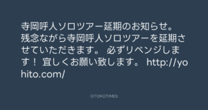 寺岡呼人ソロツアー延期のお知らせ。