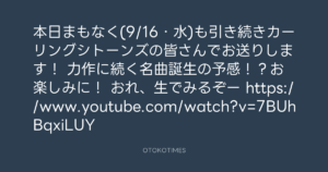 寺岡呼人 @yohito_teraoka – 19:54・2020年9月16日 2020 9/16 寺岡呼人 2020-09-16 本日まもなく(9/16・水)も引き続きカーリングシトーンズの皆さんでお送りします! 力作に続く名曲誕生の予感!?お楽しみに! おれ、生でみるぞー https://www.youtube.com/watch?v=7BUhBqxiLUY Source:https://x.com/yohito_teraoka/status/13061845599... text X Post 寺岡呼人 寺岡呼人 この記事が気に入ったら フォローしてね! Follow @OtokoTimes1988 よかったらシェアしてね! URLをコピーしました! 青山英樹 @aoyama_hideki - 18:48・2020年9月16日 寺岡呼人 @yohito_teraoka - 21:21・2020年9月16日 関連記事 Artist 寺岡呼人 1968.02.07
