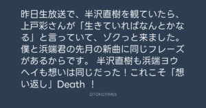 昨日生放送で、半沢直樹を観ていたら、上戸彩さんが「生きていればなんとかなる」と言っていて、ゾクっと来ました。僕と浜端君の先月の新曲に同じフレーズがあるからです。