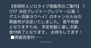 【寺岡呼人ソロライブ再販売のご案内】