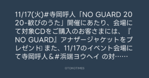 11/17(火)#寺岡呼人「NO GUARD 2020-歓びのうた」開催にあたり、会場にて対象CDをご購入のお客さまには、『NO GUARD』アナザージャケットをプレゼント♪