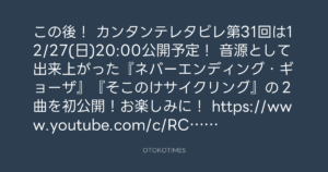 寺岡呼人 @yohito_teraoka – 18:44・2020年12月27日 2020 12/27 寺岡呼人 2020-12-27 この後! カンタンテレタビレ第31回は12/27(日)20:00公開予定! 音源として出来上がった『ネバーエンディング・ギョーザ』『そこのけサイクリング』の2曲を初公開!お楽しみに! https://www.youtube.com/c/RCMROfficialYouTubeChannel_jp Source:https://x.com/yohito_teraoka/status/13431307194... text X Post 寺岡呼人 寺岡呼人 この記事が気に入ったら フォローしてね! Follow @OtokoTimes1988 よかったらシェアしてね! URLをコピーしました! 青山英樹 @aoyama_hideki - 22:31・2020年12月26日 Koyo Maeda @koyomaeda - 15:07・2020年12月28日 関連記事 Artist 寺岡呼人 1968.02.07