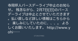 寺岡呼人 @yohito_teraoka – 15:05・2021年1月14日 2021 1/14 寺岡呼人 2021-01-14 寺岡呼人バースデーライブ中止のお知らせ。 残念ながら、2月7日(日)のバースデーライブは中止とさせていただきます。払い戻しなど詳しい情報はこちらから。 楽しみにしていたのに、、、。 よろしくお願いいたします。 http://www.yohito.com/news/20210114_001/ Source:https://x.com/yohito_teraoka/status/13495984338... text X Post 寺岡呼人 寺岡呼人 この記事が気に入ったら フォローしてね! Follow @OtokoTimes1988 よかったらシェアしてね! URLをコピーしました! 寺岡 呼人 @yohitoteraoka - 15:02・2021年1月14日(IG post) Koyo Maeda @koyomaeda - 16:47・2021年1月14日 関連記事 Artist 寺岡呼人 1968.02.07