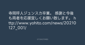 寺岡呼人 @yohito_teraoka – 23:28・2021年1月27日 2021 1/27 寺岡呼人 2021-01-27 寺岡呼人ジュンスカ卒業。 感謝と今後も両者を応援宜しくお願い致します。 http://www.yohito.com/news/20210127_001/ Source:https://x.com/yohito_teraoka/status/13544360094... text X Post 寺岡呼人 寺岡呼人 この記事が気に入ったら フォローしてね! Follow @OtokoTimes1988 よかったらシェアしてね! URLをコピーしました! 青山英樹 @aoyama_hideki - 23:01・2021年1月27日 寺岡 呼人 @yohitoteraoka - 23:31・2021年1月27日(IG post) 関連記事 Artist 寺岡呼人 1968.02.07