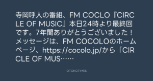寺岡呼人の番組、FM COCLO『CIRCLE OF MUSIC』本日24時より最終回です。7年間ありがとうございました!