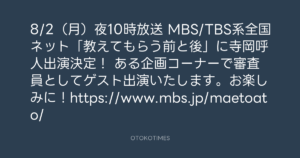 寺岡呼人 @yohito_teraoka – 8:58・2021年7月27日 2021 7/27 寺岡呼人 2021-07-27 8/2(月)夜10時放送 MBS/TBS系全国ネット「教えてもらう前と後」に寺岡呼人出演決定! ある企画コーナーで審査員としてゲスト出演いたします。お楽しみに!https://www.mbs.jp/maetoato/ Source:https://x.com/yohito_teraoka/status/14198093562... text X Post 寺岡呼人 寺岡呼人 この記事が気に入ったら フォローしてね! Follow @OtokoTimes1988 よかったらシェアしてね! URLをコピーしました! 青山英樹 @aoyama_hideki - 22:19・2021年7月24日 寺岡 呼人 @yohitoteraoka - 09:01・2021年7月27日(IG post) 関連記事 Artist 寺岡呼人 1968.02.07