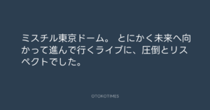 寺岡呼人 @yohito_teraoka – 23:39・2022年5月10日 2022 5/10 寺岡呼人 2022-05-10 ミスチル東京ドーム。 とにかく未来へ向かって進んで行くライブに、圧倒とリスペクトでした。 Source:https://x.com/yohito_teraoka/status/15240365011... text X Post 寺岡呼人 寺岡呼人 この記事が気に入ったら フォローしてね! Follow @OtokoTimes1988 よかったらシェアしてね! URLをコピーしました! 前田 耕陽 @koyo.maeda - 16:13・2022年5月10日(IG post) Koyo Maeda @koyomaeda - 13:51・2022年5月11日 関連記事 Artist 寺岡呼人 1968.02.07