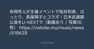 寺岡呼人が主催イベントで桜井和寿、はっとり、長屋晴子とコラボ!日本武道館公演をU-NEXTで(動画あり / 写真10枚) https://natalie.mu/music/news/518628