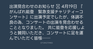 共に能登を応援しようと賛同いただき、コンサートに足を運んでいただく皆様には、急なお知らせとなりご心配とご迷惑をお掛けしますが、事情をご配慮いただきまして、何卒ご理解賜りますようお願い申し上げます。