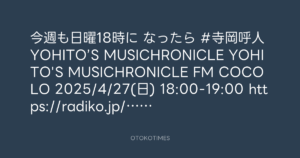 YOHITO’S MUSICHRONICLE FM COCOLO 2025/4/27(日) 18:00-19:00 https://radiko.jp/share/?t=20250427180000&sid=CCL #radiko #シェアラジコ #fmcocolo765 #日曜日 #寺岡呼人