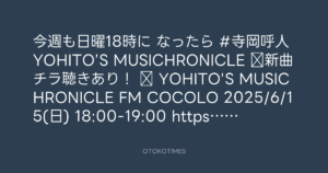 YOHITO’S MUSICHRONICLE FM COCOLO 2025/6/15(日) 18:00-19:00 https://radiko.jp/share/?t=20250615180000&sid=CCL #radiko #シェアラジコ #fmcocolo765 #日曜日 #寺岡呼人
