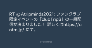 Addict of The Tripminds @Atripminds2021 – 21:34・2023年2月10日 2023 2/10 ADDICT OF THE TRIP MINDS 岡本健一 2023-02-10 RT @Atripminds2021: ファンクラブ限定イベントの「clubTripS」の一般配信が決まりました! 詳しくはhttps://aotm.jp/ にて。 Source:https://x.com/Atripminds2021/status/16240239394... ADDICT OF THE TRIP MINDS text X Post 岡本健一 ADDICT OF THE TRIP MINDS 岡本健一 この記事が気に入ったら フォローしてね! Follow @OtokoTimes1988 よかったらシェアしてね! URLをコピーしました! Kazuya Takahashi @hankykazy - 14:44・2023年2月10日(IG post) Addict of The Tripminds @Atripminds2021 - 21:36・2023年2月10日 関連記事 Artist ADDICT OF THE TRIP MINDS 1993.10.01 Artist 岡本健一 1969.05.21