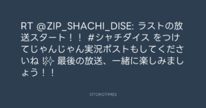 SHACHIHOKO PARADISE @ZIP_SHACHI_DISE – 20:01・2025年9月14日 2025 9/14 成田昭次 2025-09-14 RT @ZIP_SHACHI_DISE: ラストの放送スタート!! #シャチダイス をつけてじゃんじゃん実況ポストもしてくださいね!✨ 最後の放送、一緒に楽しみましょう!!🔥 Source:https://x.com/ZIP_SHACHI_DISE/status/1967181855... text X Post 成田昭次 成田昭次 この記事が気に入ったら フォローしてね! Follow @OtokoTimes1988 よかったらシェアしてね! URLをコピーしました! SHACHIHOKO PARADISE @ZIP_SHACHI_DISE - 20:00・2025年9月14日 SHACHIHOKO PARADISE @ZIP_SHACHI_DISE - 20:04・2025年9月14日 関連記事 ラジオ ZIP-FM「SHACHIHOKO PARADISE」 2024.10.13 Artist 成田昭次 1968.08.01