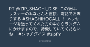 RT @ZIP_SHACHI_DISE: この後は、リスナーのみなさんと直接、電話でお喋りする #SHACHIHOCALL !📞