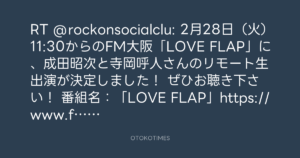 RT @rockonsocialclu: 2月28日(火)11:30からのFM大阪「LOVE FLAP」に、成田昭次と寺岡呼人さんのリモート生出演が決定しました!