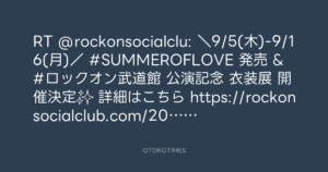 Rockon Social Club @rockonsocialclu – 12:00・2024年8月30日 2024 8/30 Rockon Social Club 2024-08-30 RT @rockonsocialclu: \9/5(木)-9/16(月)/ #SUMMEROFLOVE 発売 & #ロックオン武道館 公演記念 衣装展 開催決定👕✨ 詳細はこちら👇 https://rockonsocialclub.com/2024/08/30/3345/ Source:https://x.com/rockonsocialclu/status/1829353597... Rockon Social Club text X Post Rockon Social Club この記事が気に入ったら フォローしてね! Follow @OtokoTimes1988 よかったらシェアしてね! URLをコピーしました! Rockon Social Club @rockonsocialclu - 12:00・2024年8月30日 OTOKOTIMES @OtokoTimes1988 - 12:10・2024年8月30日 関連記事 Artist Rockon Social Club 2023.02.17