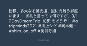🎬 Addict of the Trip Minds @atripminds2021 – 16:35・2022年3月26日(IG post) 2022 3/26 ADDICT OF THE TRIP MINDS 2022-03-26 皆様、多大なる御支援、誠に有難う御座います! 御礼と言っては何ですが、3/10DayDreamTrip ‘幻影’をどうぞ! #atripminds2021 #川上シゲ #岡本健一 #shim_on_off #男闘呼組 Source:https://www.instagram.com/p/CbjxAd9B5Da/ ADDICT OF THE TRIP MINDS IG Post VIDEO 岡本健一 ADDICT OF THE TRIP MINDS この記事が気に入ったら フォローしてね! Follow @OtokoTimes1988 よかったらシェアしてね! URLをコピーしました! 🎬 Addict of the Trip Minds @atripminds2021 - 16:35・2022年3月26日(IG post) 青山英樹 @aoyama_hideki - 17:47・2022年3月26日 関連記事 Artist ADDICT OF THE TRIP MINDS 1993.10.01 Artist 岡本健一 1969.05.21