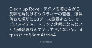 Clean up Rave…テクノを聴きながら瓦礫を片付けるウクライナの若者。爆弾落ちた場所にDJブース設置するて、すごいアイデア。トランス状態にならないと瓦礫処理なんてやってられないか。https://t.co/j3omAtrNn4