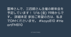 きゃんじぃ @CanzQR84 – 16:52・2026年1月4日 2026 1/04 2026-01-04 OTOKOTIMESさんがリポスト雷神さんで、三四朗さん主催の新年会を予定しています! 1/16 (金) 19時からです。 詳細未定 参加ご希望の方は、私までDMくださいませ。 #koyo810 #HeartFM810 Source:https://x.com/CanzQR84/status/2007721823270834405 text X Post この記事が気に入ったら フォローしてね! Follow @OtokoTimes1988 よかったらシェアしてね! URLをコピーしました! Heart FM @Heartfm_Radio - 16:25・2026年1月4日 HMVららぽーと横浜 @HMV_Lalayoko - 18:04・2026年1月4日